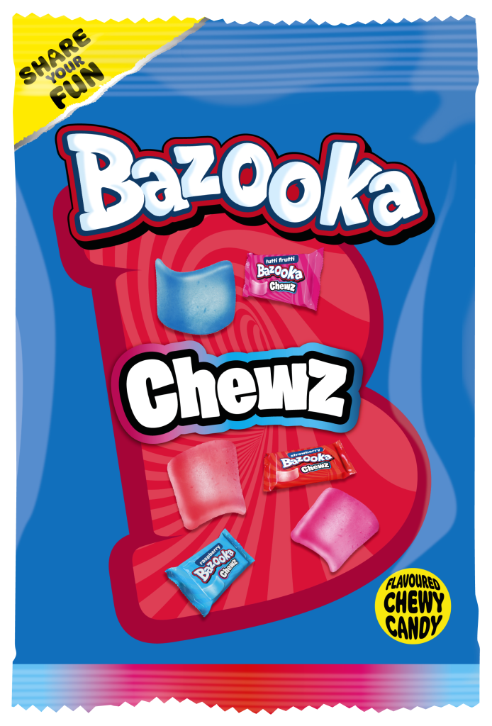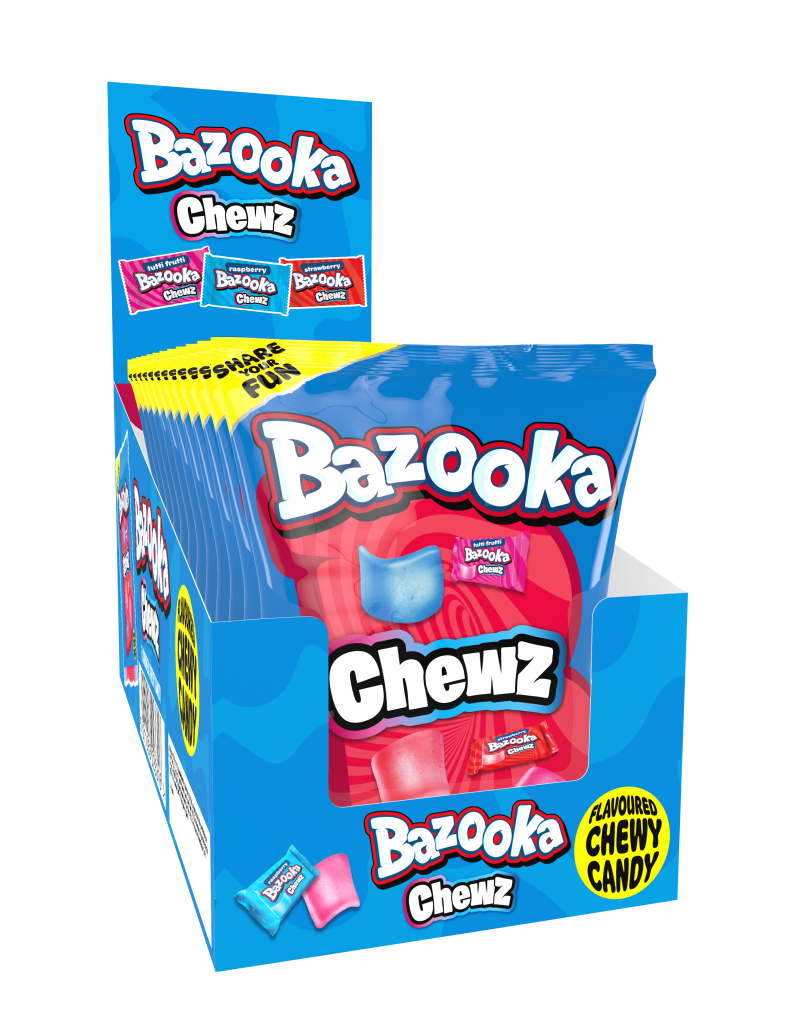 Individually wrapped mini bites of soft taffy US style chewy candy. Fun treats for all the family, Bazooka Chewz come in 3 delicious flavours; Raspberry, Strawberry and Tutti Frutti. Each bite size sweet delivers an exciting sweet experience perfect for soft chew lovers!