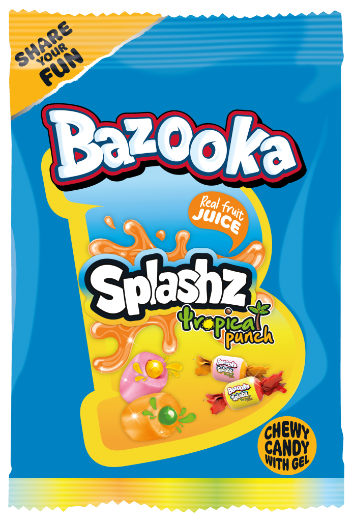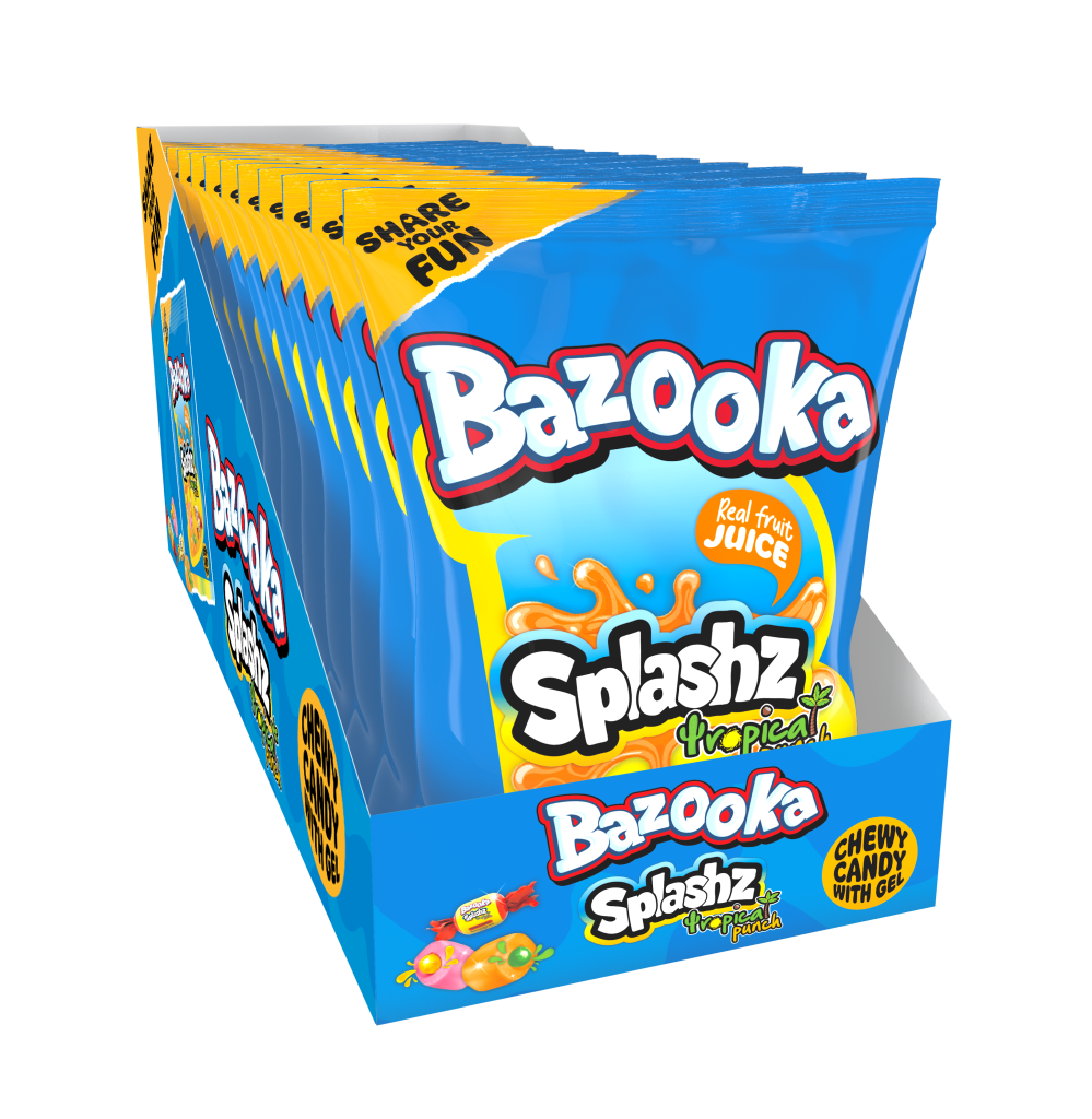 Individually wrapped mini bites of deliciously flavoured chewy candies with a burst of sour gel inside. Fun treats for all the family, Bazooka Splashz come in 3 delicious varieties; Berry Blast, Tropical Punch and Fruit Fiesta. Each bite size sweet delivers an exciting sweet experience perfect for soft chew lovers!